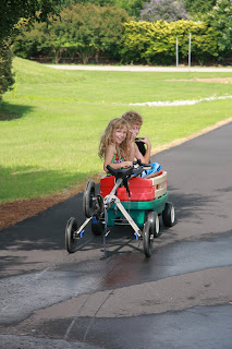 Try to get out of the way of your child who is driving so you are not run over while trying to capture the moment! Notice that Wesley is still not all the way in the wagon. lol